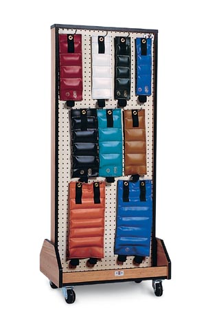 Almond laminated pegboard panel on front. 11 pegboard safety hooks. Black laminate panel on back with 18 dumbbell hooks. Oak laminate frame and base. Rubber tire casters. 24?W x 18?D x 57?H. |